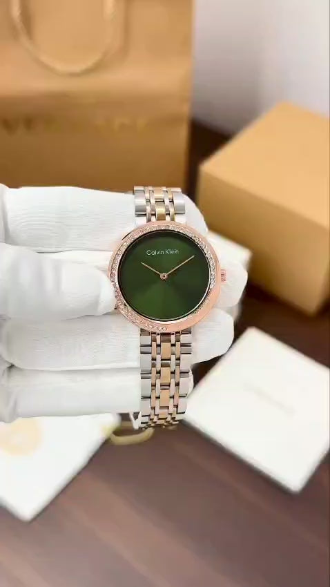 Calvin Klein Twisted Bezel Qtz Basic Slim Green Round Dial Women's Watch|Ionic Plated Rose Gold Steel Material|Rose Gold Color Band - 25100068
