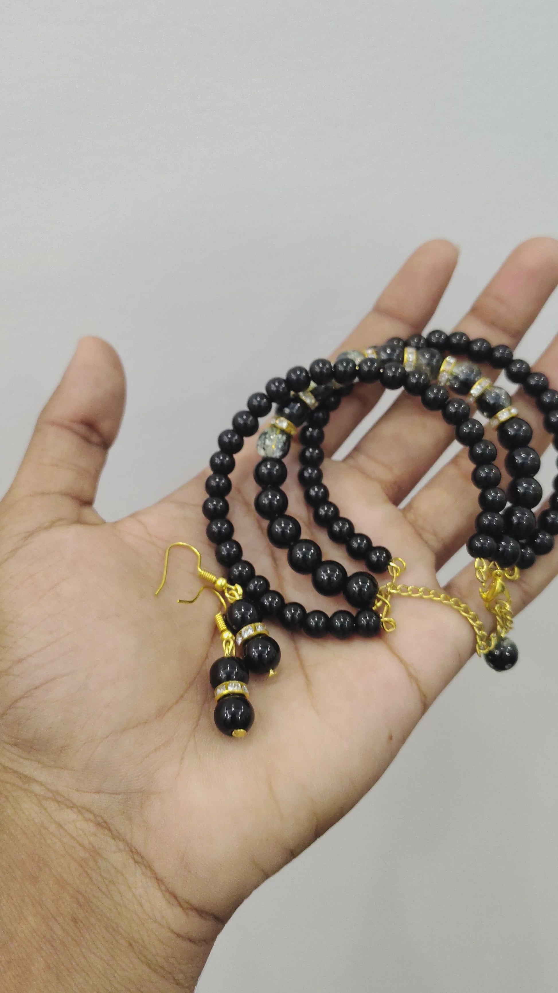 This stunning triple-layer black bead bracelet is designed to bring out your inner elegance with a hint of luxury. Each layer is beautifully hand-crafted using premium glossy black beads that reflect light perfectly, creating a rich, polished look. The centerpiece features golden crystal accent beads with delicate gold-plated separators, adding a graceful sparkle that stands out effortlessly.